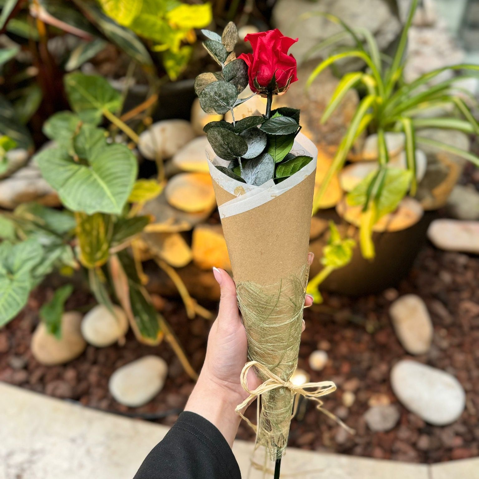 Um elemento discreto, mas essencial, que transforma a rosa num presente visualmente completo e pronto para encantar.